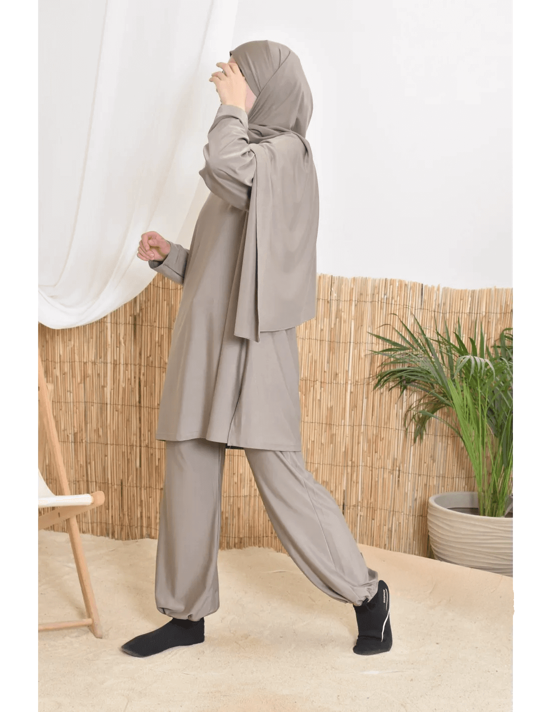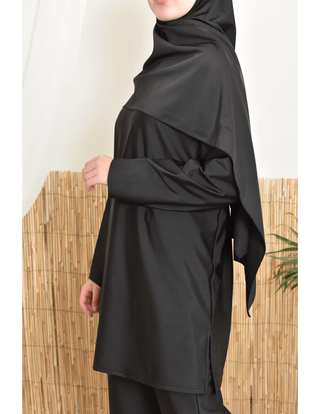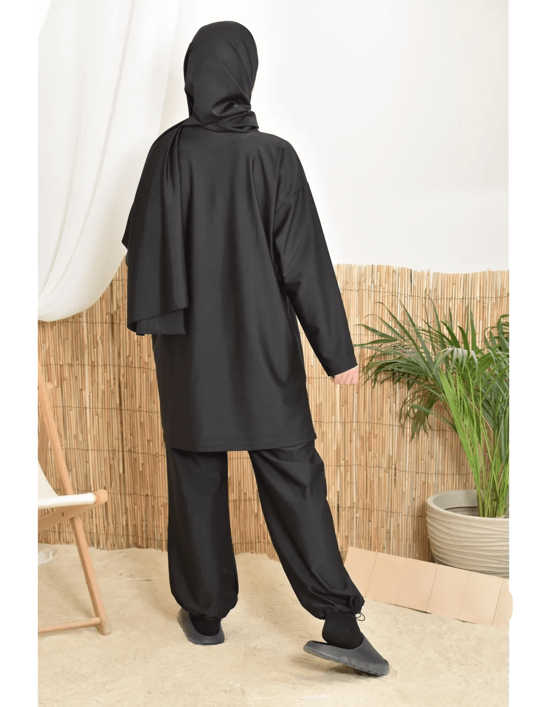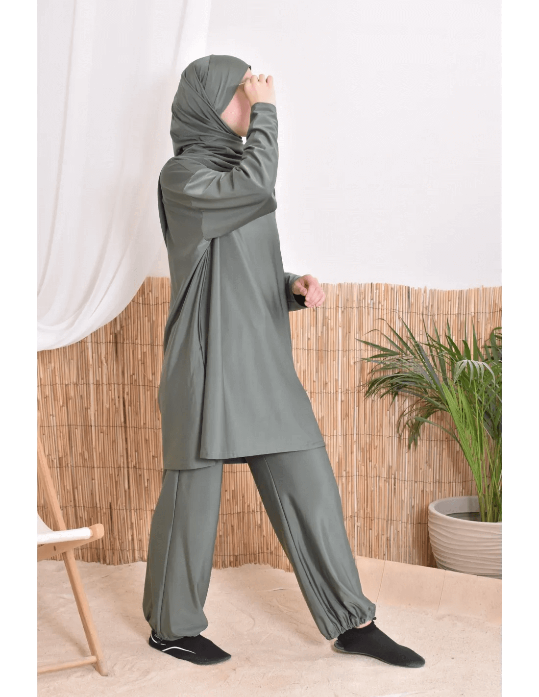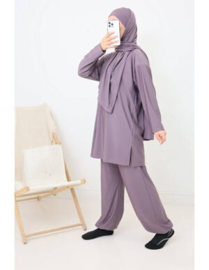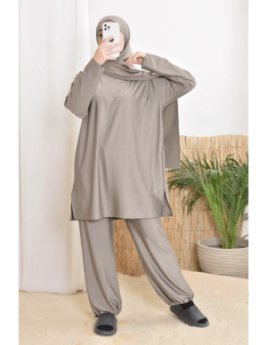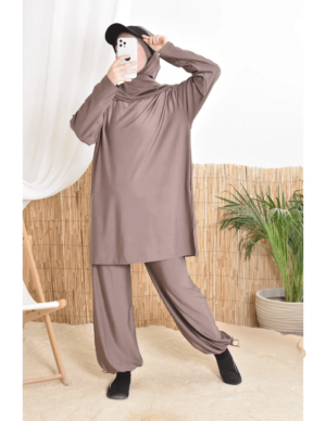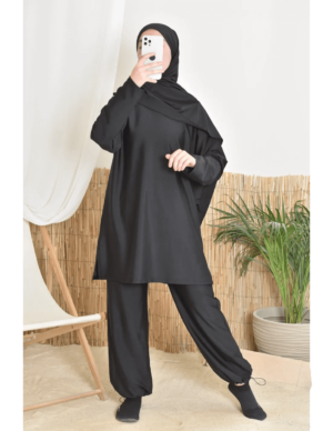 بوركيني ليلى بتصميم بسيط وأنيق يناسب المرأة المحجبة الباحثة عن الراحة والأناقة في الماء أو على الشاطئ.