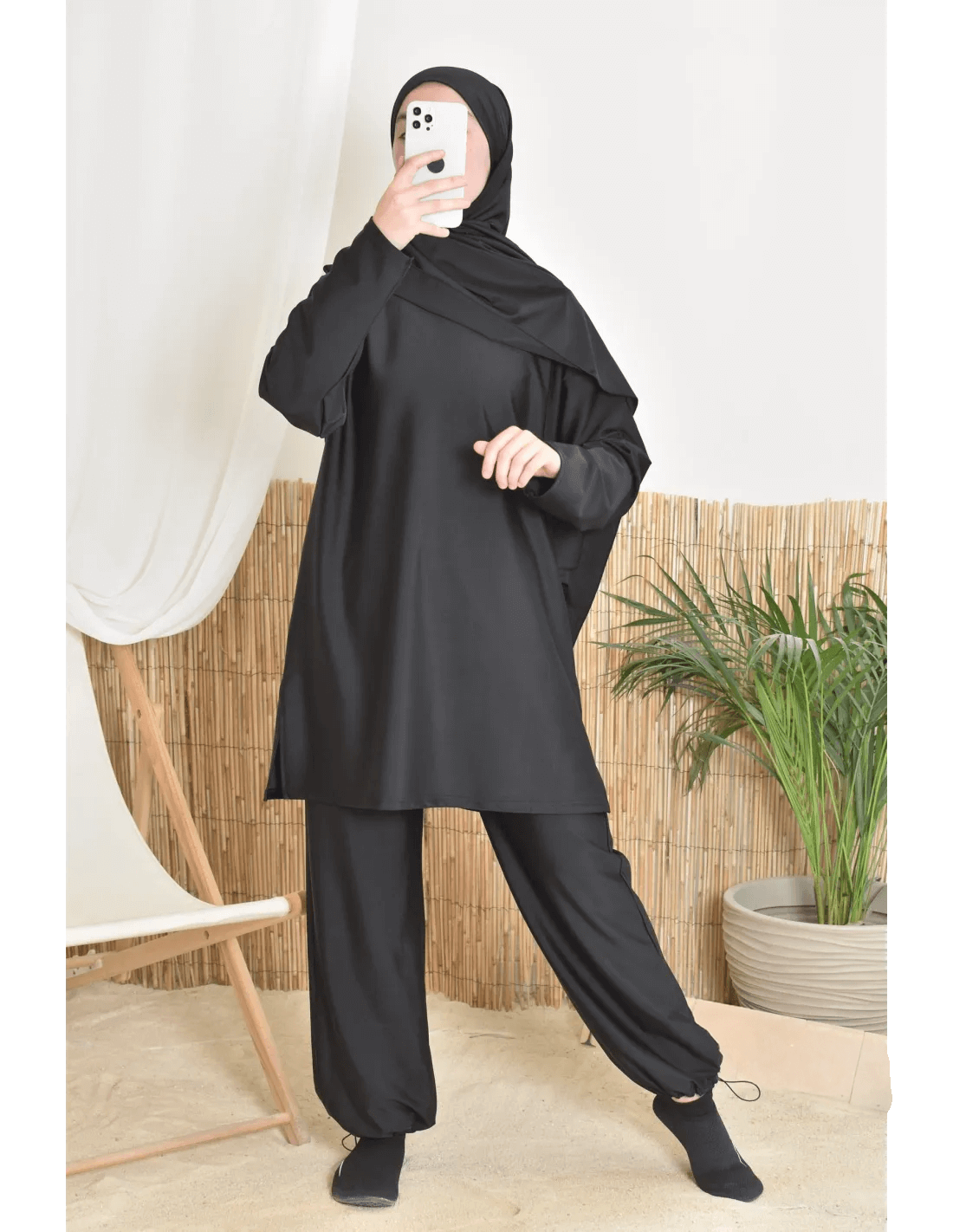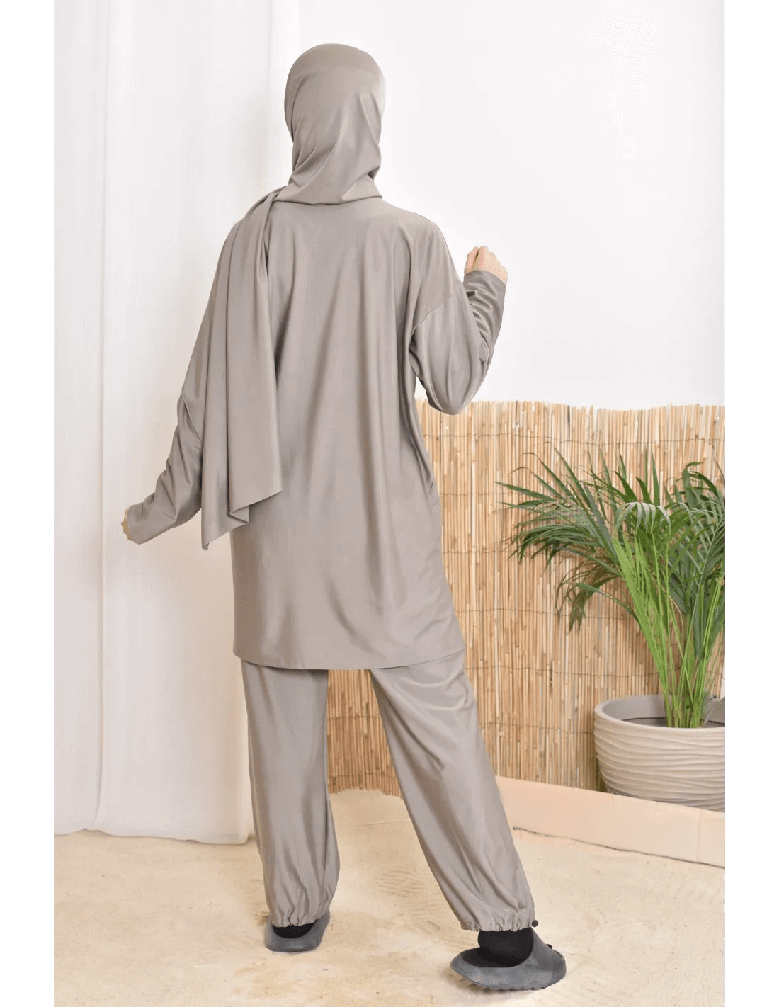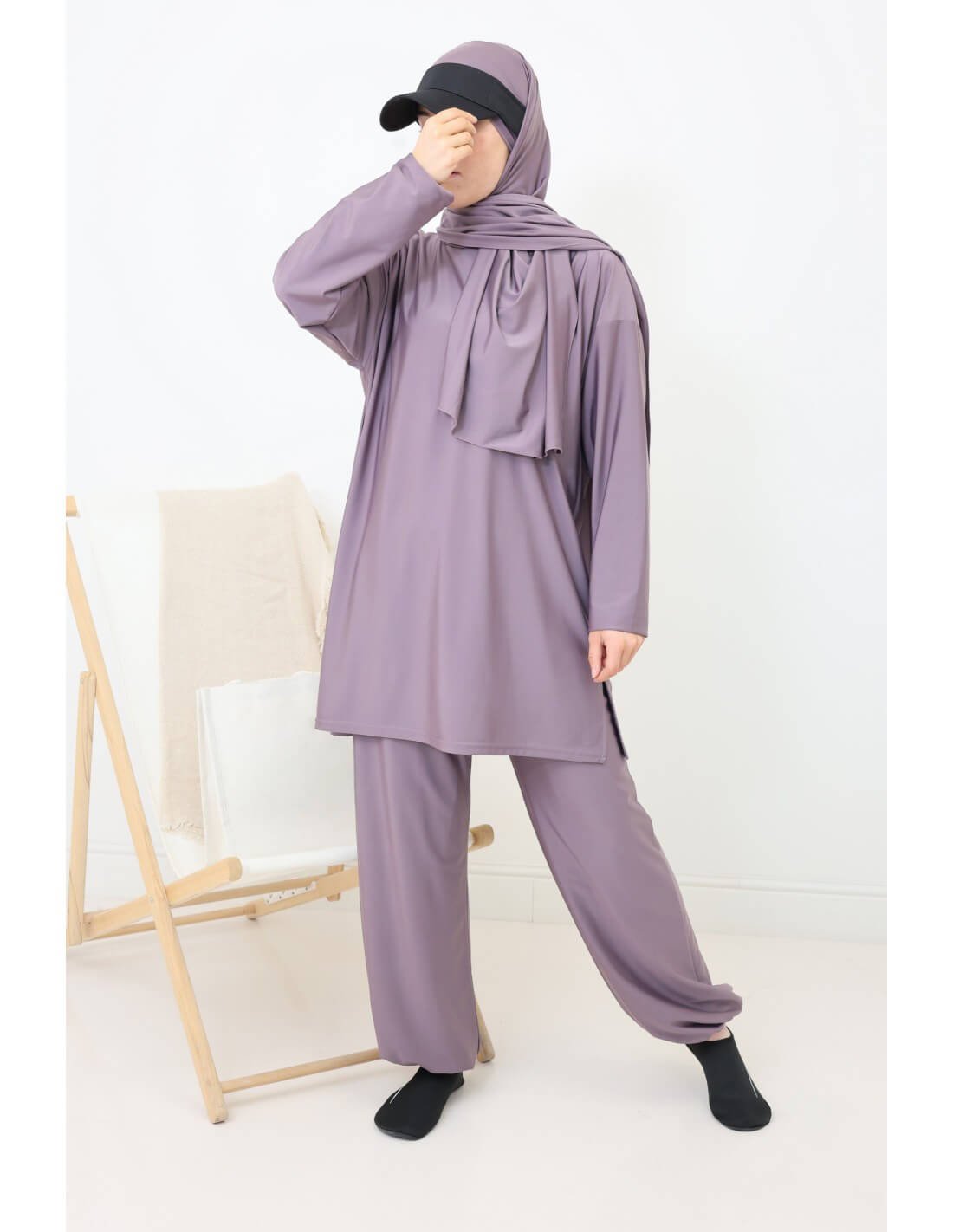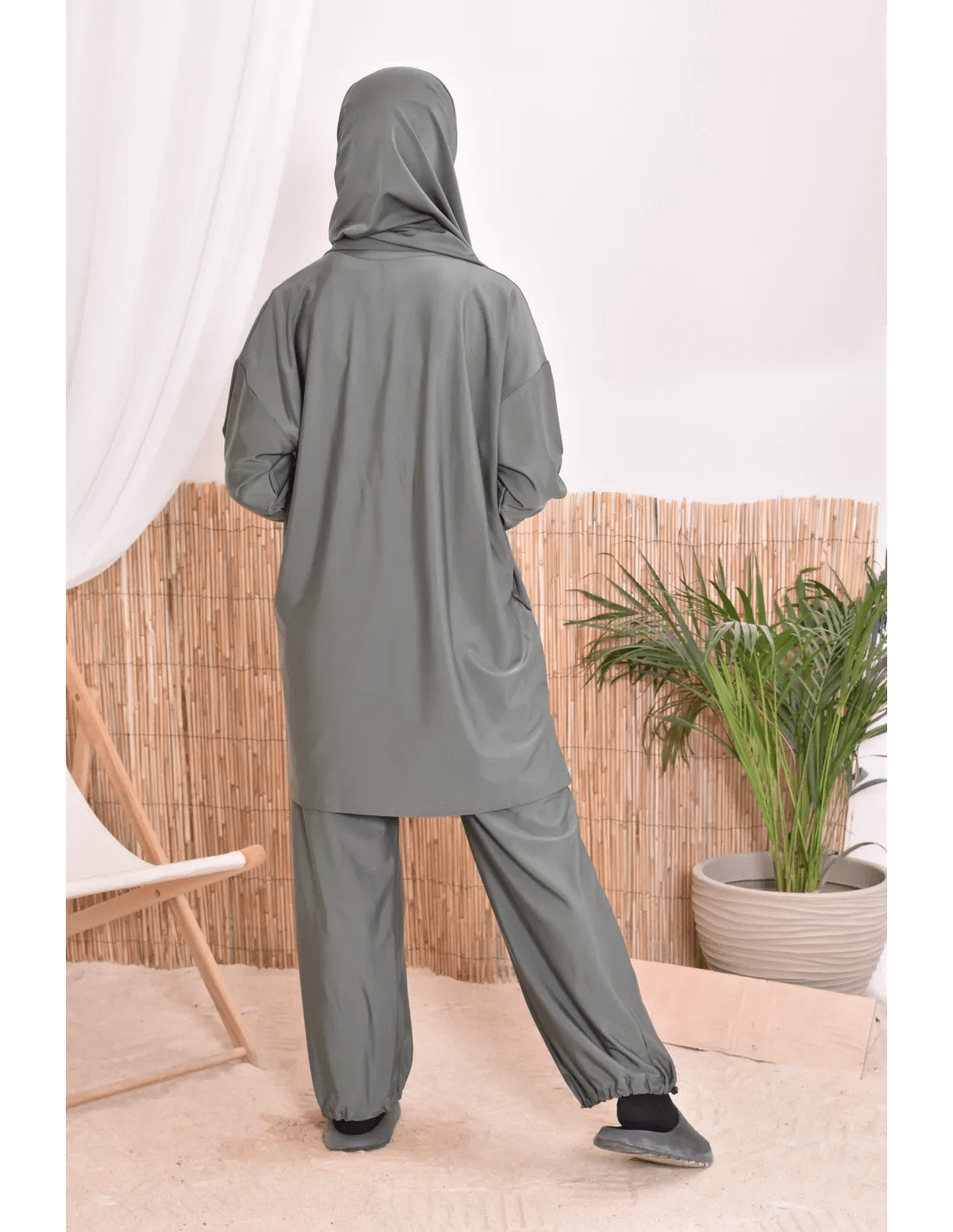 بوركيني ليلى بتصميم بسيط وأنيق يناسب المرأة المحجبة الباحثة عن الراحة والأناقة في الماء أو على الشاطئ.
