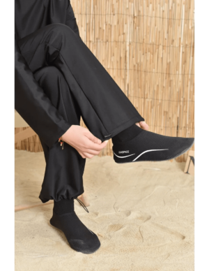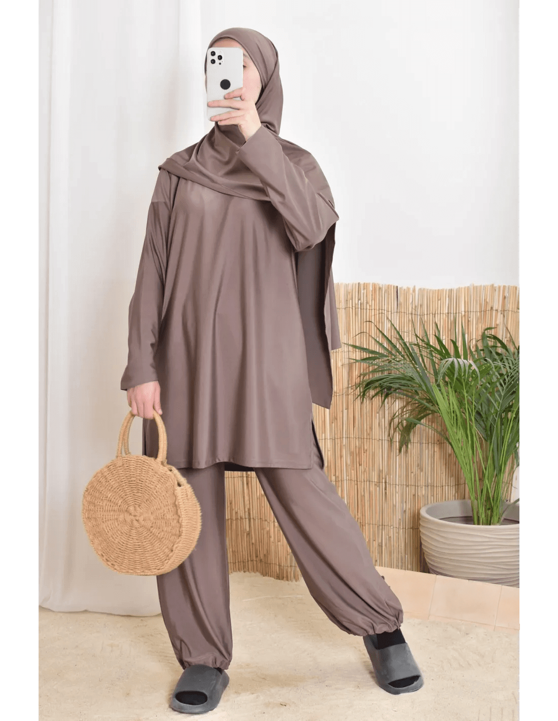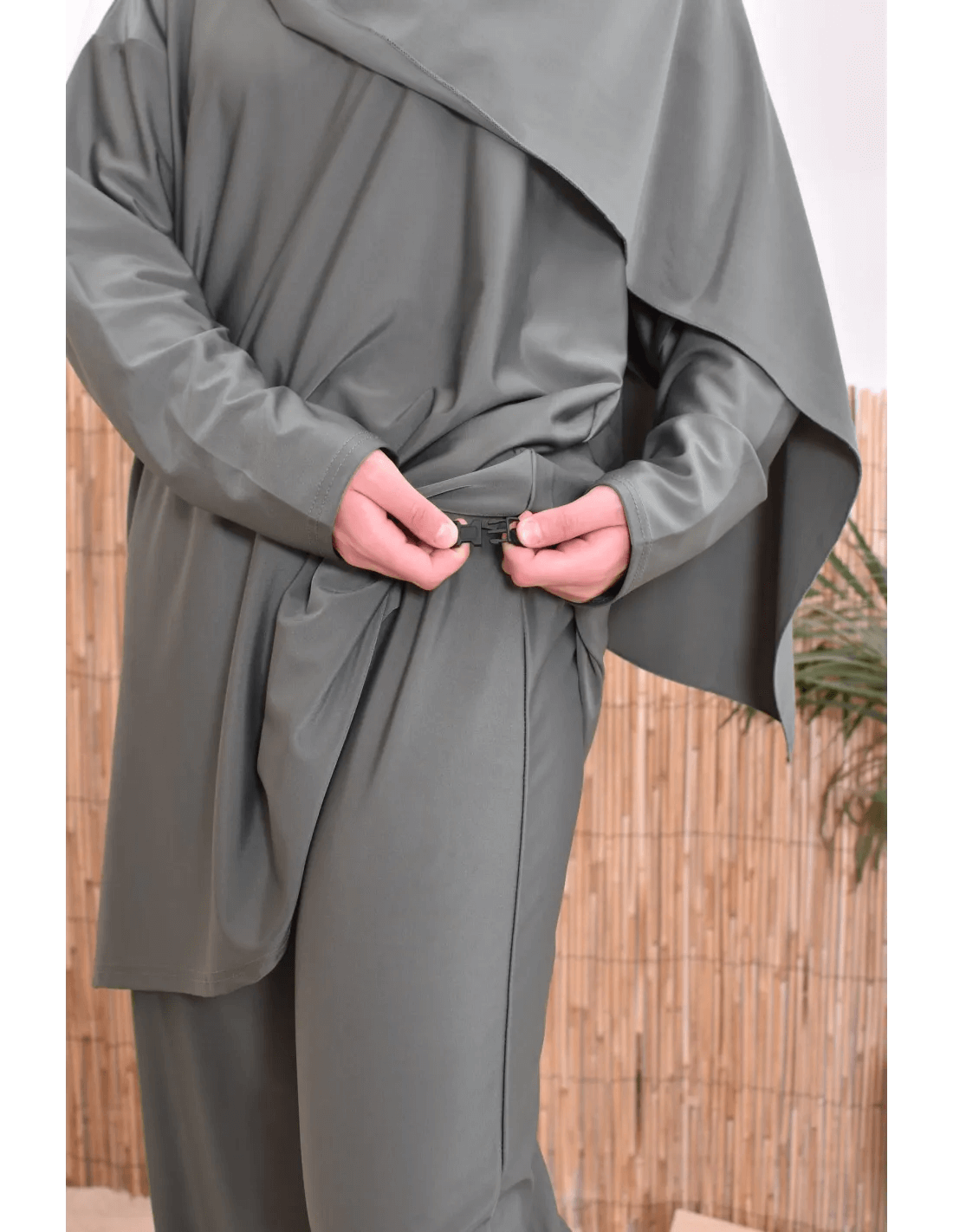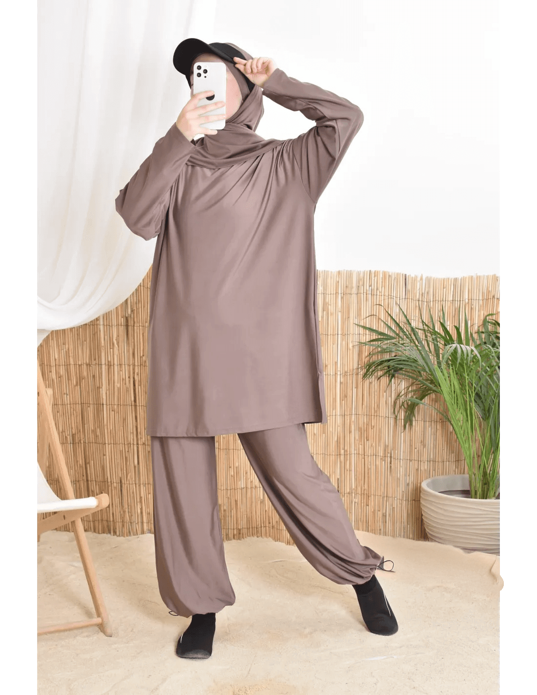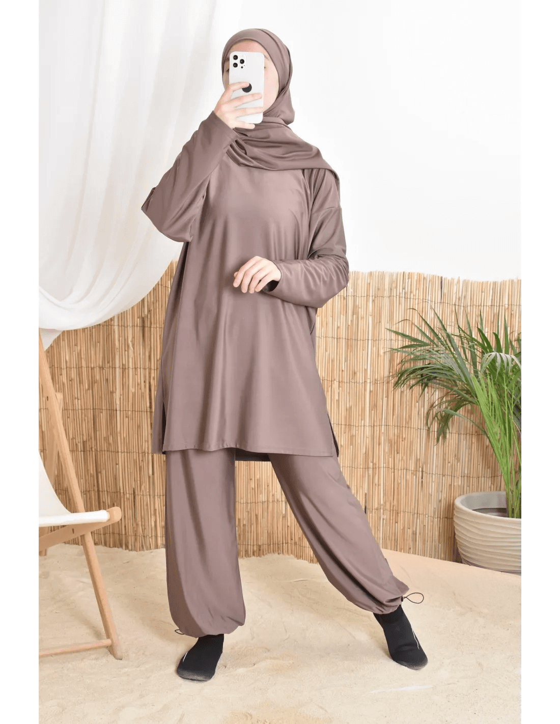 بوركيني ليلى بتصميم بسيط وأنيق يناسب المرأة المحجبة الباحثة عن الراحة والأناقة في الماء أو على الشاطئ.