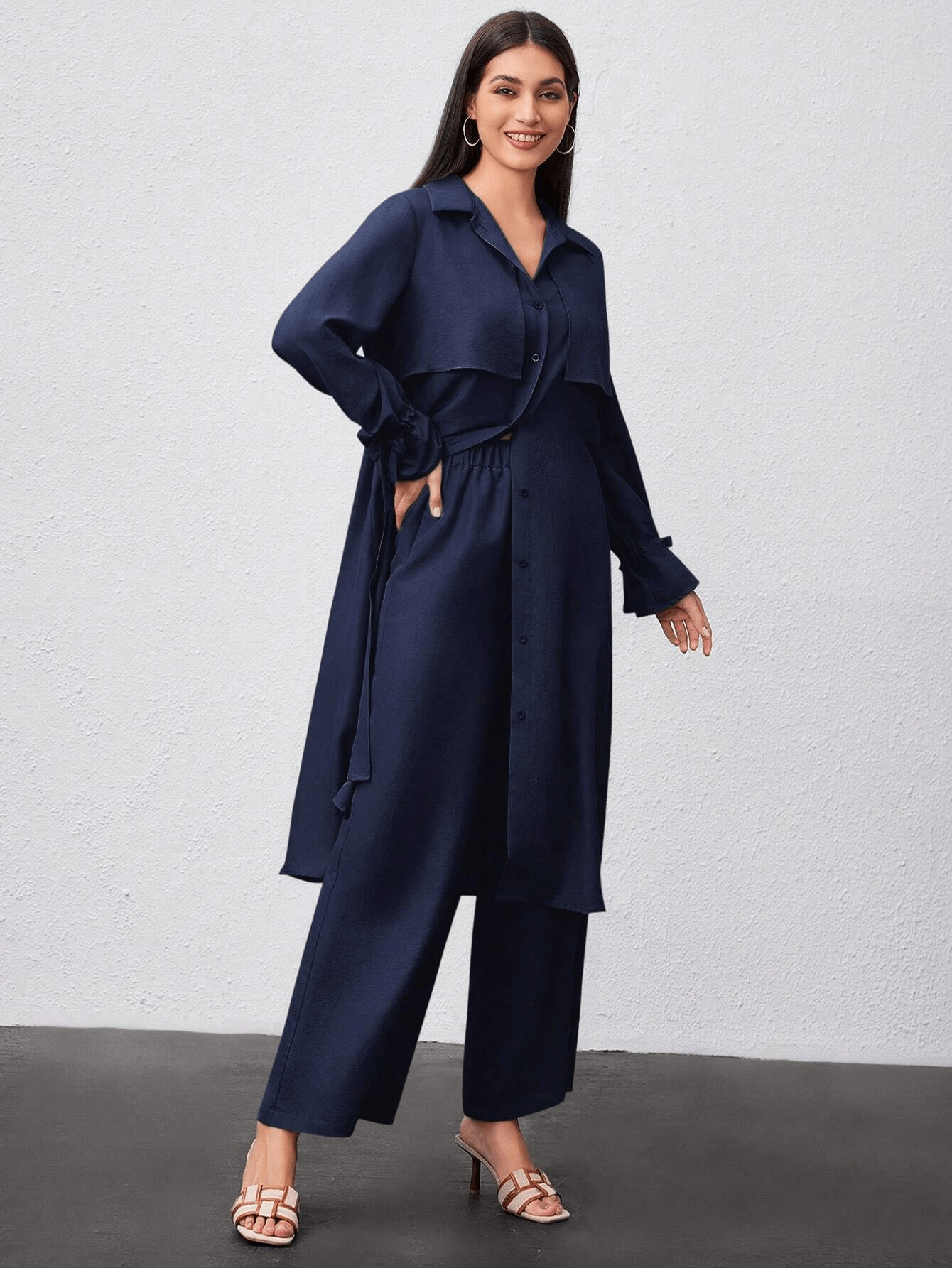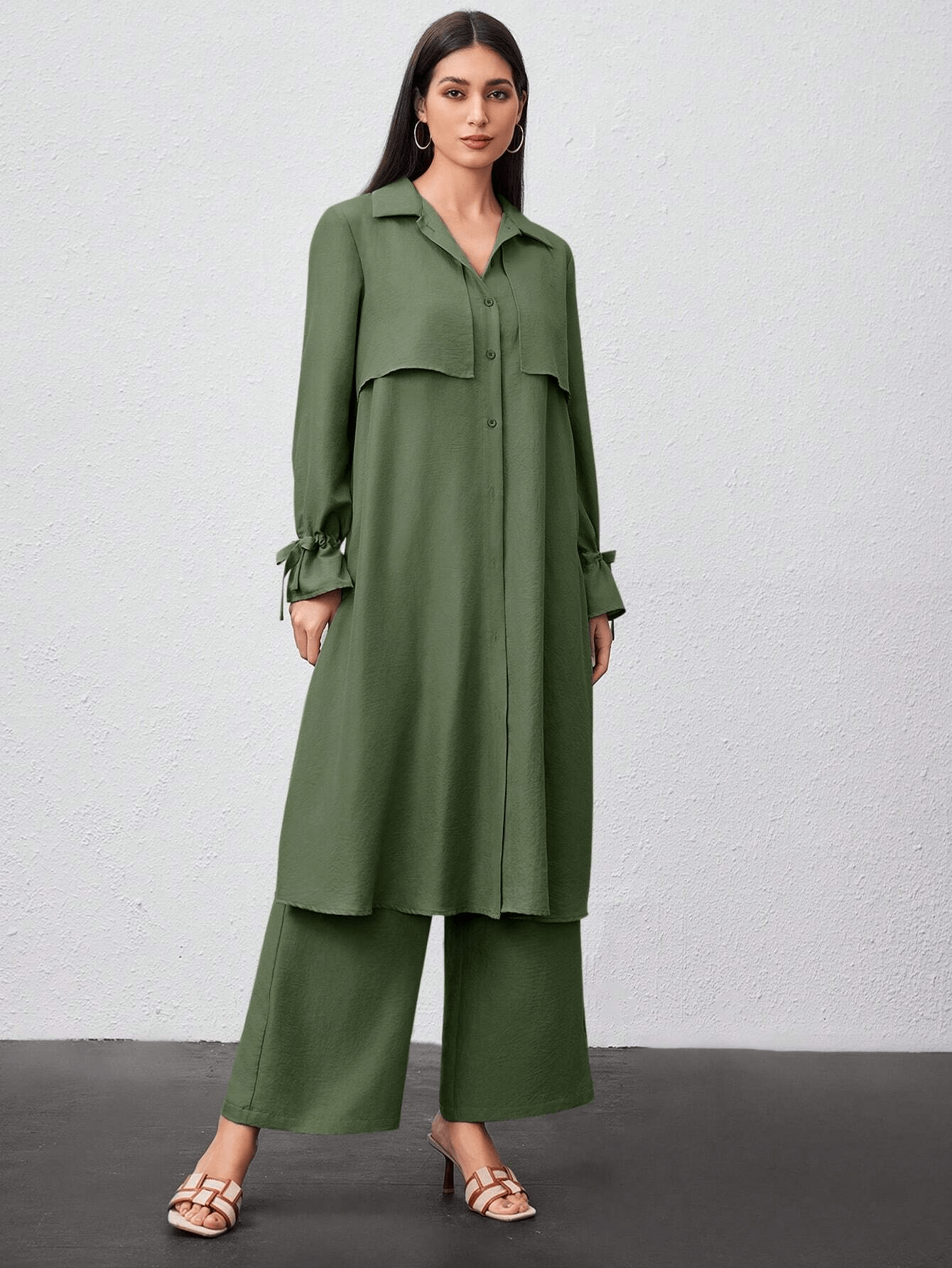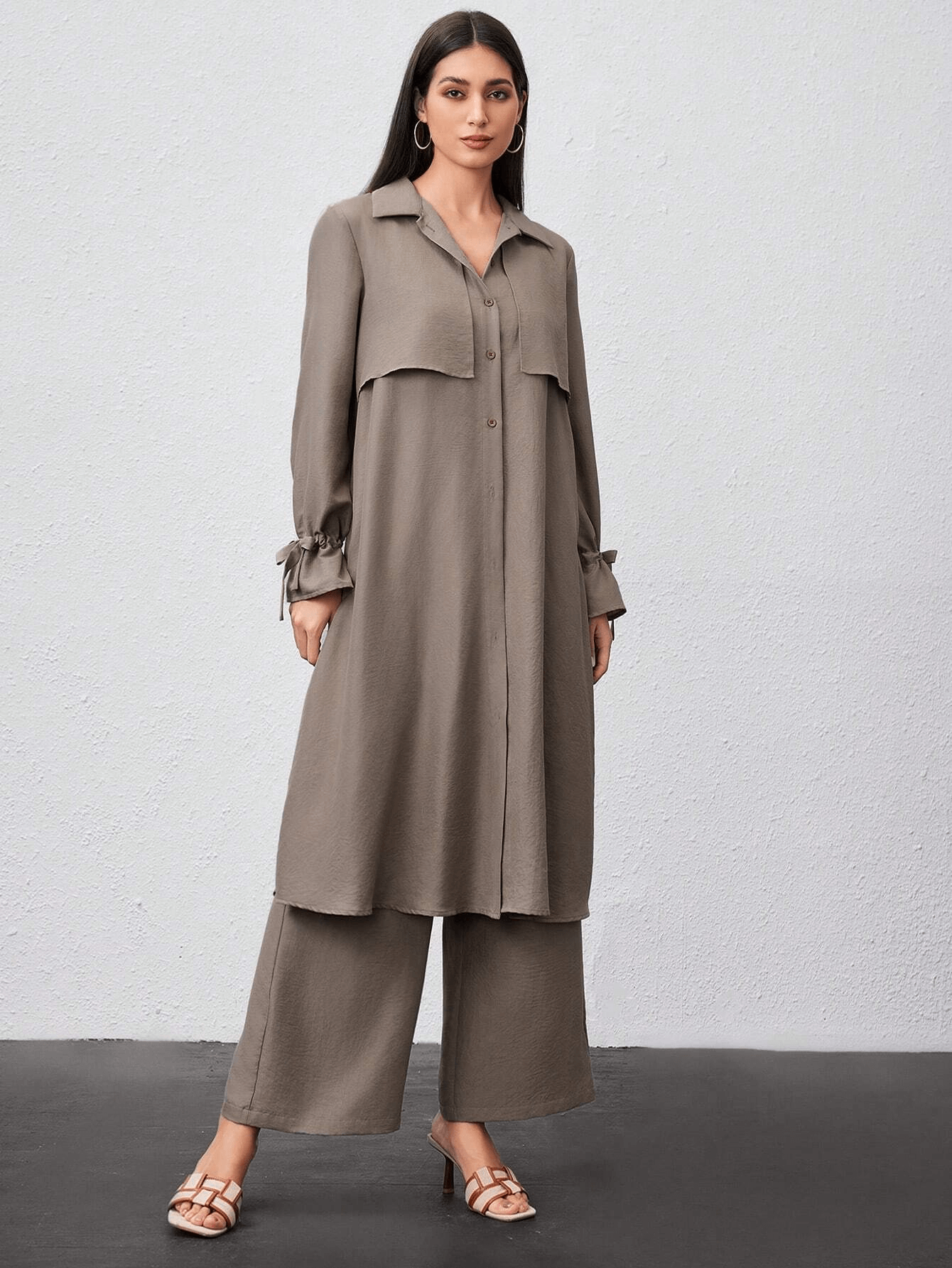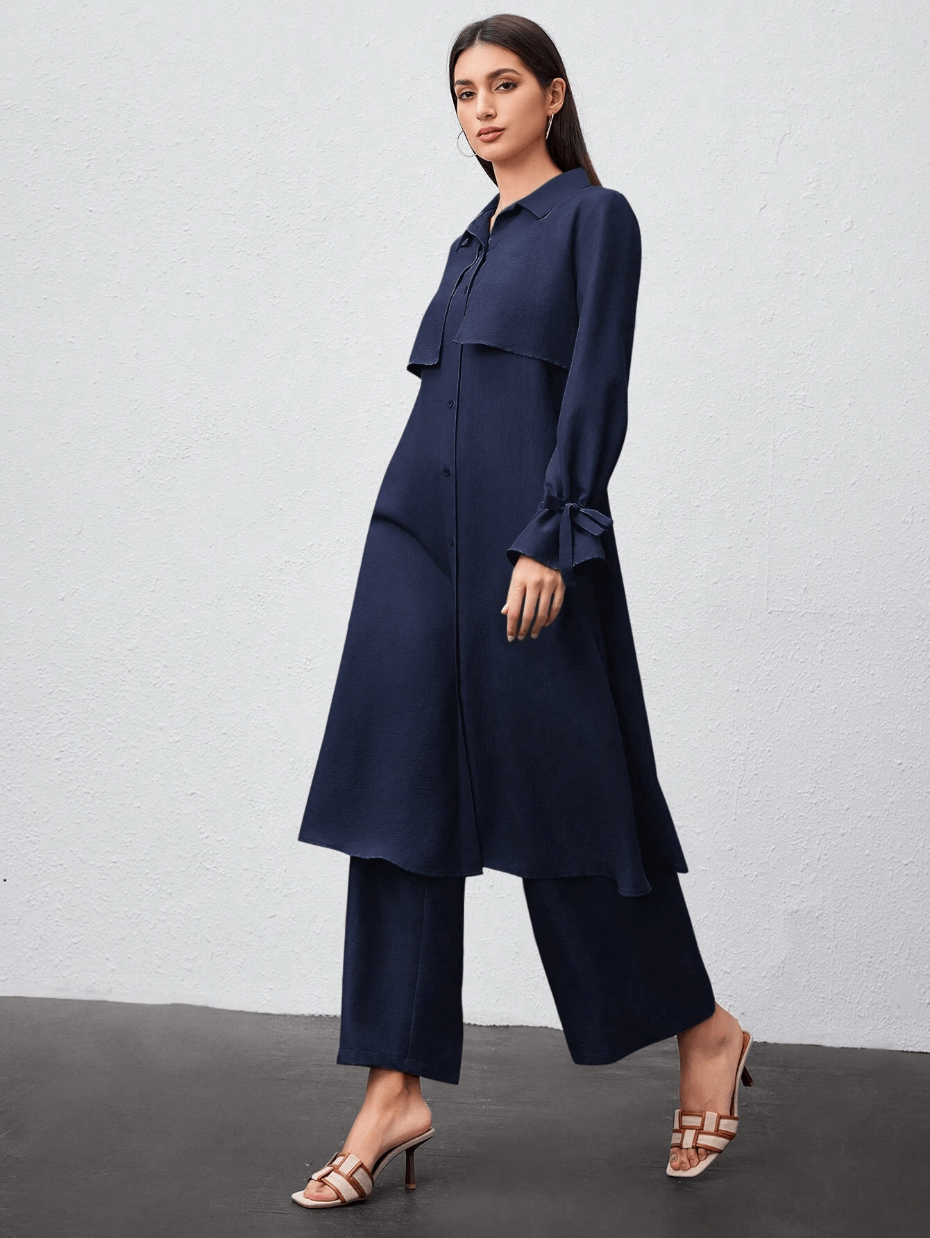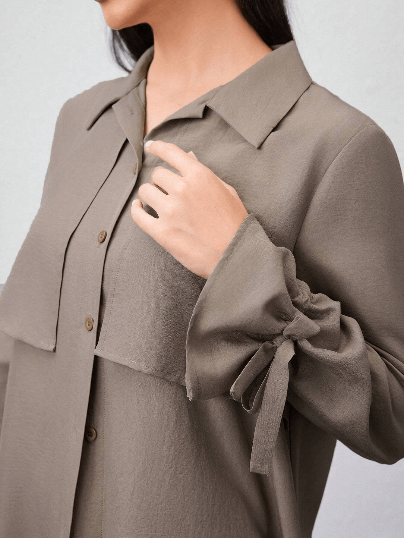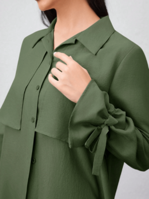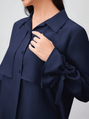 قميص طويل بأزرار أمامية وياقة كلاسيكية، مزين بطبقة أمامية تضيف لمسة عصرية ناعمة، وأكمام بأربطة جانبية أنيقة