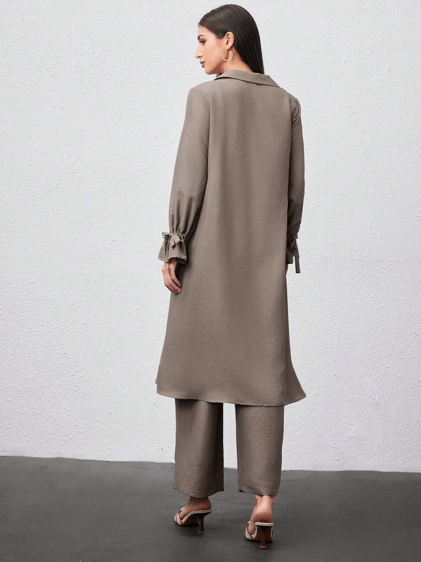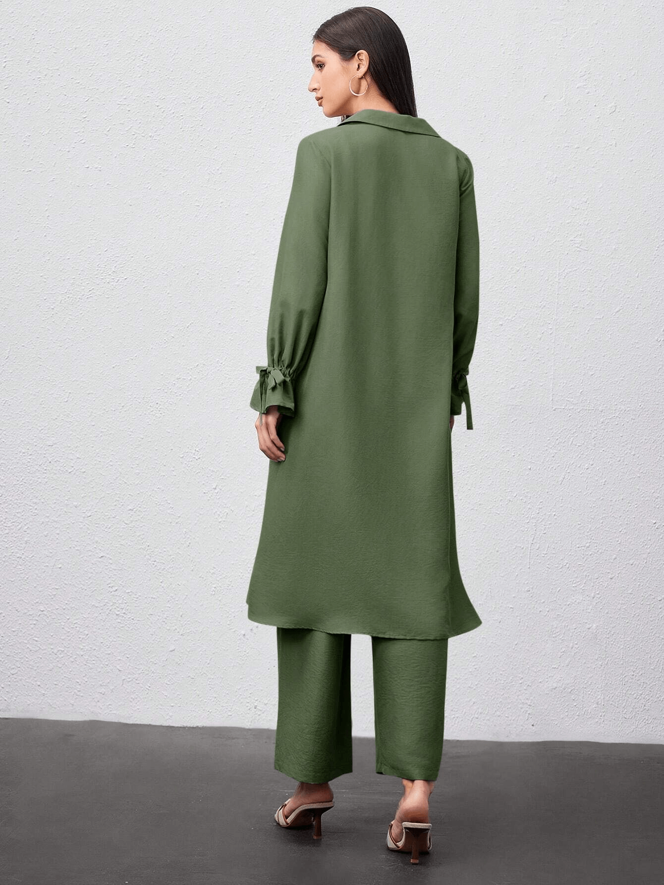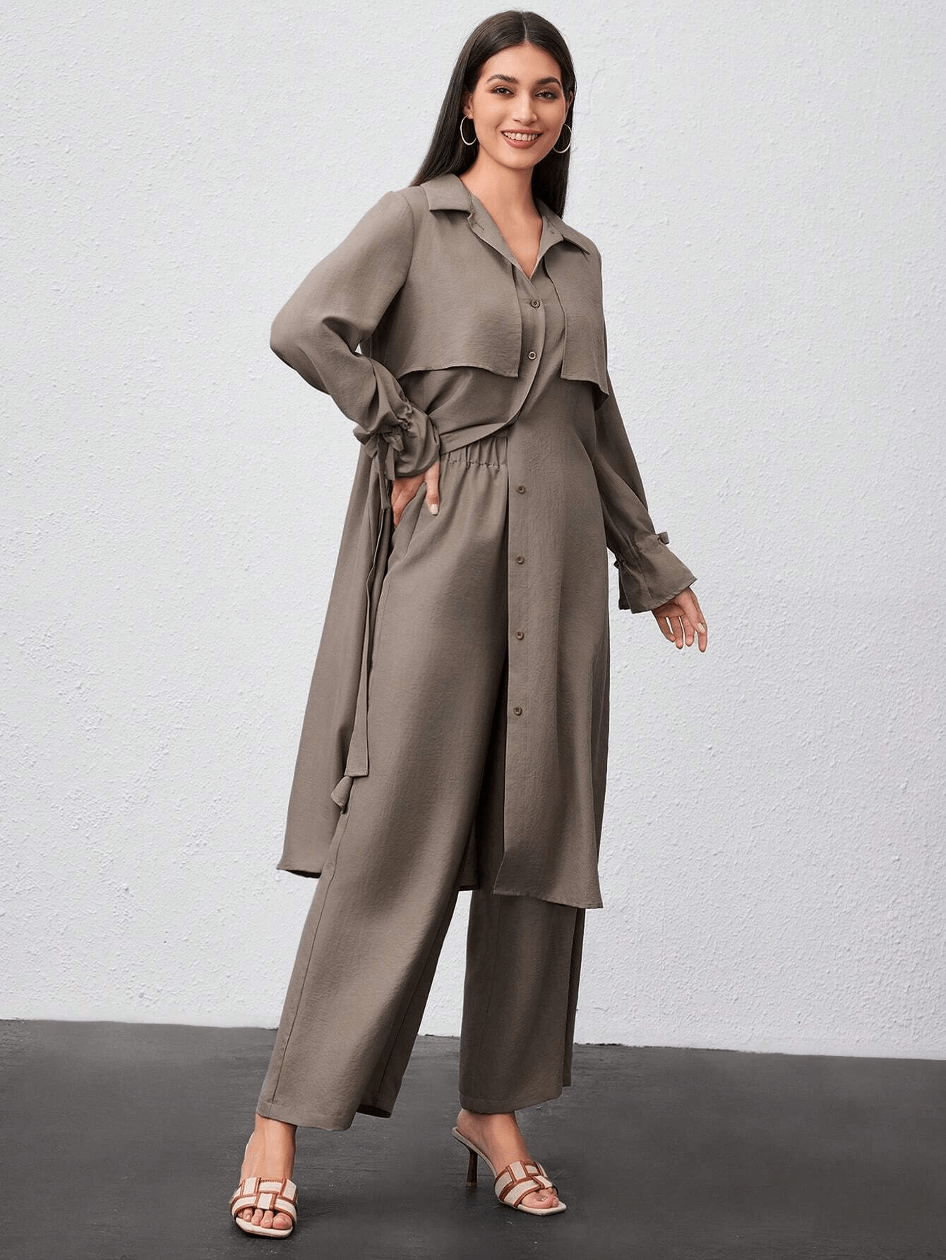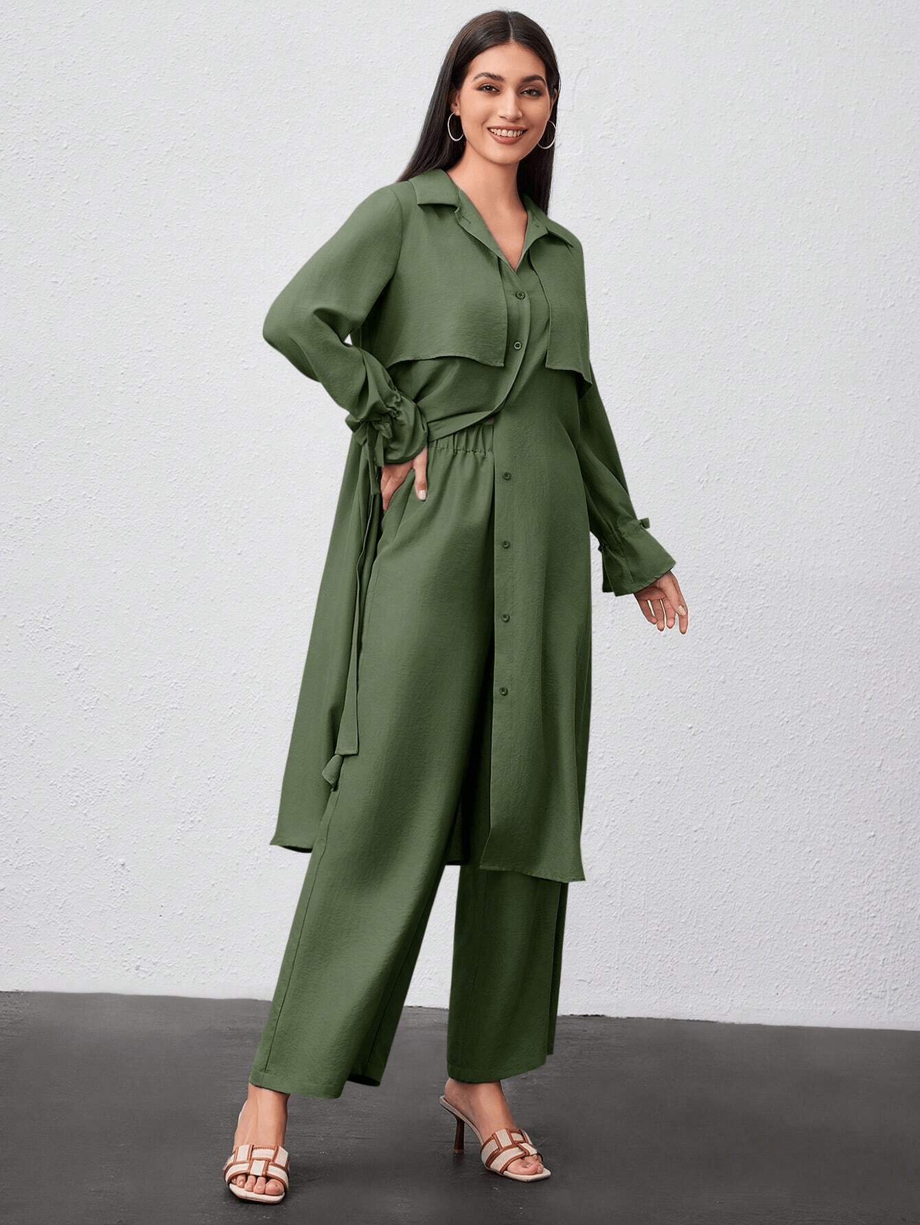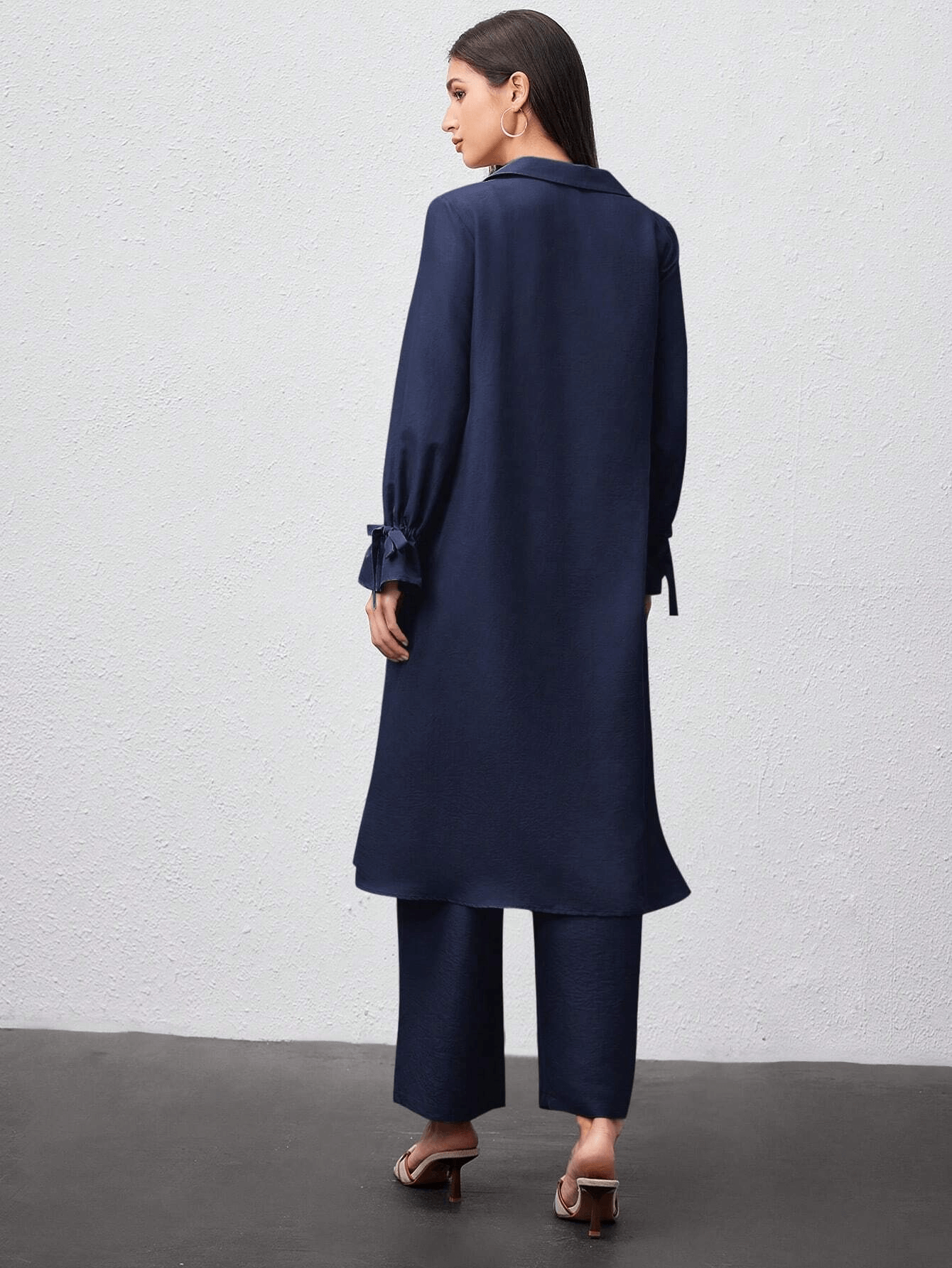 قميص طويل بأزرار أمامية وياقة كلاسيكية، مزين بطبقة أمامية تضيف لمسة عصرية ناعمة، وأكمام بأربطة جانبية أنيقة